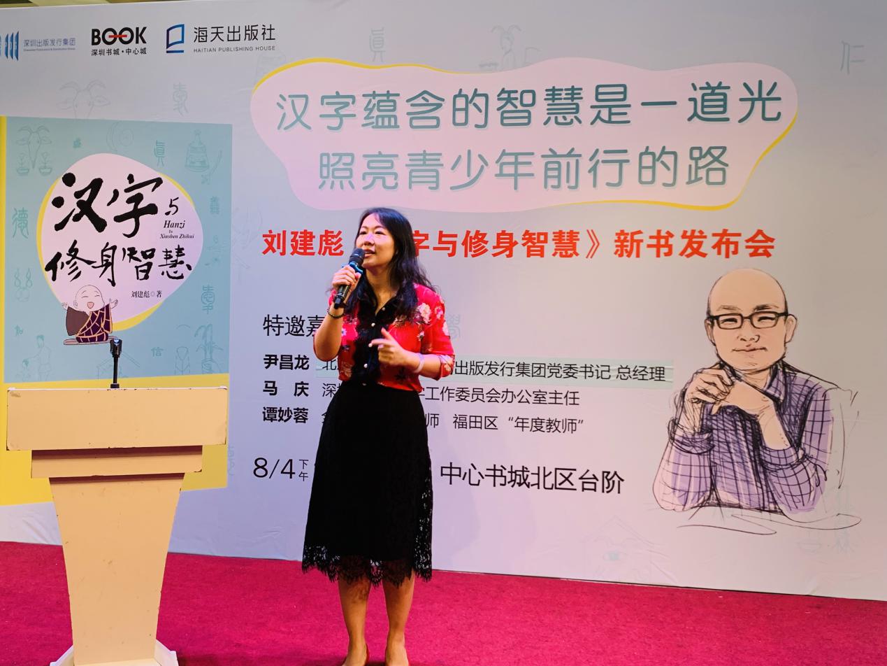 深圳出版發(fā)行集團黨委書記、總經(jīng)理尹昌龍在發(fā)言中指出,漢字里蘊藏著中華文明的密碼,而《漢字與修身智慧》這本書恰是從漢字出發(fā),解讀中華文化的基因,以美德教育為旨歸,有助于喚起我們對漢字的熱愛,對民族文化的自信。他向在場觀眾推薦這本書,并指其信息量大,兼具趣味性、可讀性與啟發(fā)性,值得細細品味。另外,馬慶主任表示,漢字投射的是古人的心靈,古人的智慧,古人的修養(yǎng),他贊嘆《漢字與修身智慧》一書為深圳的文化積累做出了貢獻,并鼓勵親子共讀,共同成長。譚妙蓉老師也力薦此書,認為書中漢字心能量中的小故事深入淺出,富含哲理,對青少年乃至成年人美德教育均有借鑒作用,并聲情并茂地朗誦了書中的《陋室銘》一文,她希望作者將來能創(chuàng)作出更多關(guān)于漢字的書,讓更多讀者感受到傳統(tǒng)文化的熏陶與滋養(yǎng)。