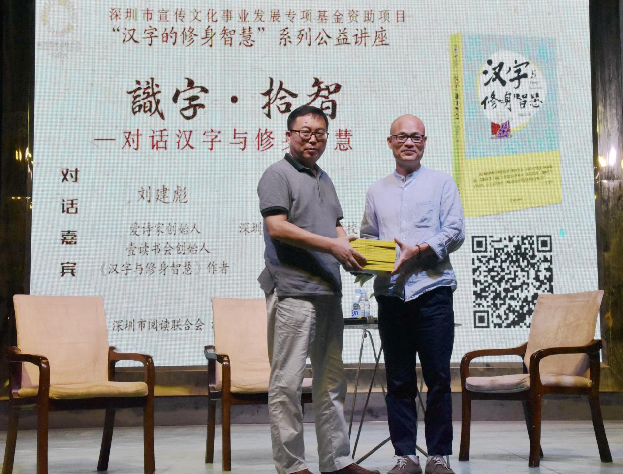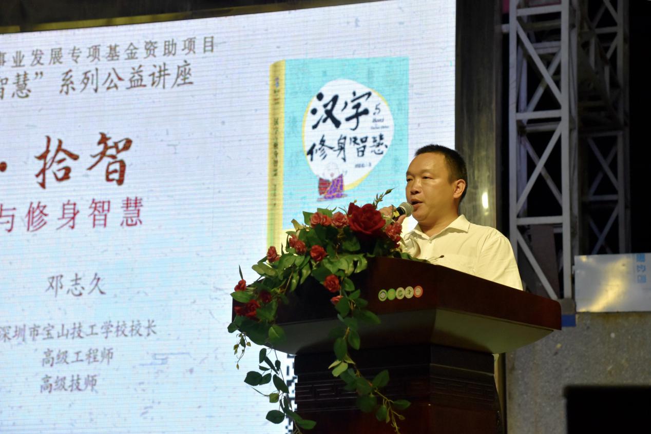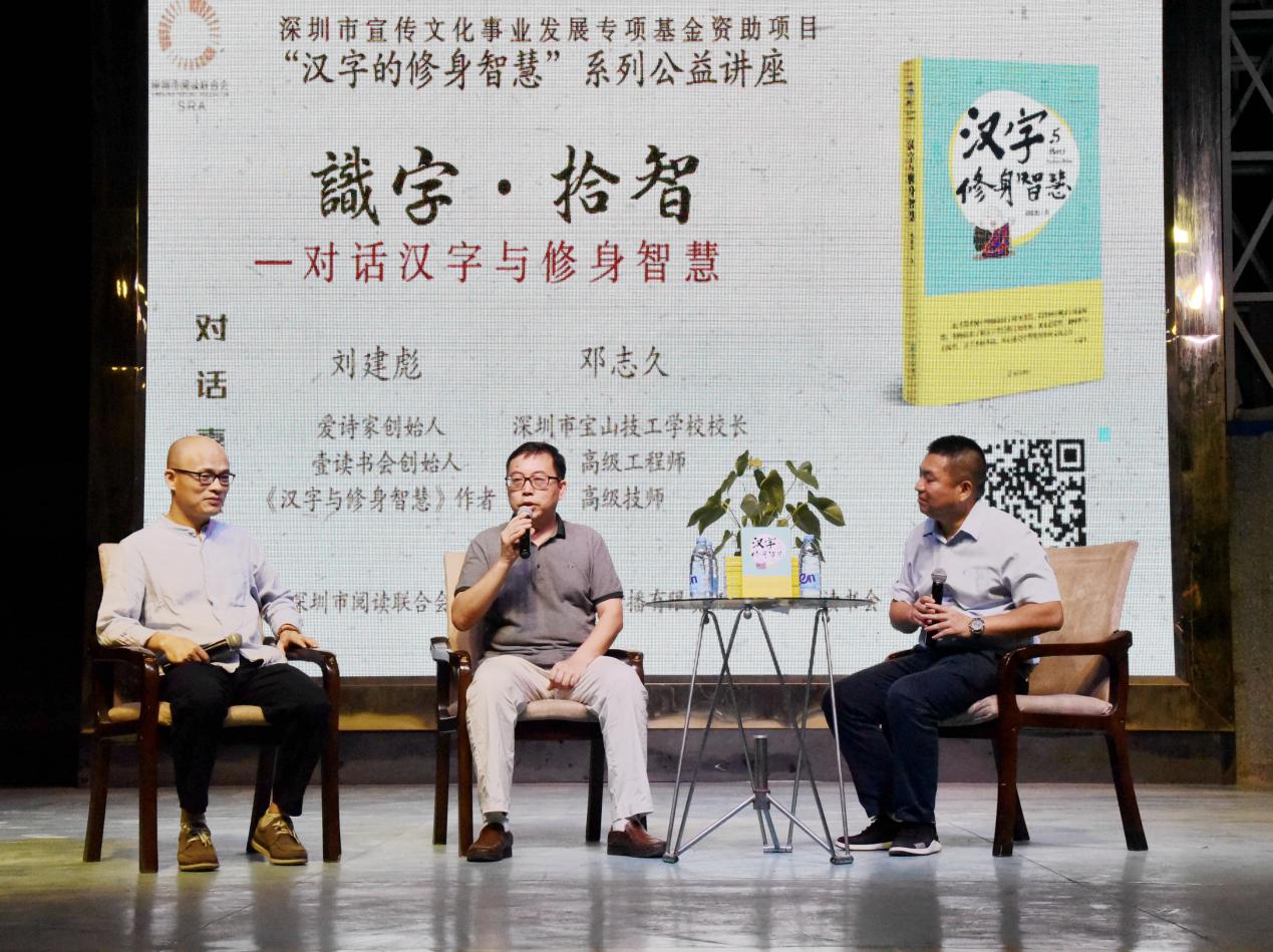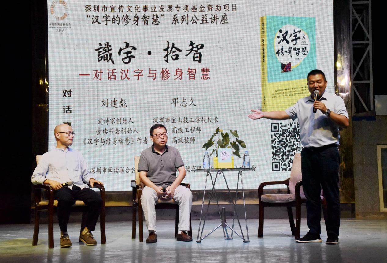 深圳新聞網(wǎng)訊 9月18日晚上7時,由深圳市閱讀聯(lián)合會、深圳市壹書文化傳播有限責任公司和寶山讀書會共同主辦的“‘識字拾智’——對話漢字與修身智慧”公益文化講座在寶山技工學校寶山大舞臺拉開了序幕。據(jù)悉,這是由深圳市宣傳文化事業(yè)發(fā)展專項基金資助項目“漢字的修身智慧”的第三場公益文化講座,以劉建彪《漢字與修身智慧》新書分享為契機,傳播漢字正能量,讓更多的青少年識字長智,領略漢字文化之精妙。