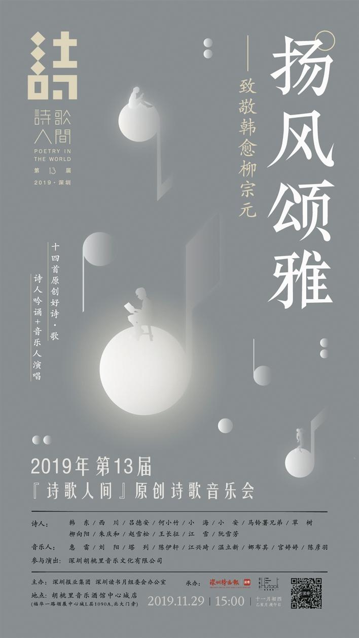 本屆“詩歌人間”由深圳讀書月組委會(huì)辦公室、深圳報(bào)業(yè)集團(tuán)主辦,深圳特區(qū)報(bào)社、深圳合縱文化集團(tuán)承辦,并得到了深圳市宣傳文化基金支持。今年,“詩歌人間”再度牽手老朋友合縱文化集團(tuán),以詩歌朗誦加歌唱的方式,于11月29日下午3點(diǎn)在合縱旗下胡桃里音樂酒館中心城店共同打造重頭活動(dòng)“第十三屆‘詩歌人間’原創(chuàng)詩歌音樂會(huì)”。屆時(shí),深圳特區(qū)報(bào)及“讀特”客戶端將全程跟蹤報(bào)道,“詩歌人間”音樂會(huì)盛況將通過“讀特”等平臺(tái)在網(wǎng)絡(luò)同步直播。通過深圳特區(qū)報(bào)“讀特”客戶端成功報(bào)名參與現(xiàn)場活動(dòng)的市民,還將獲得專屬精美紀(jì)念品。