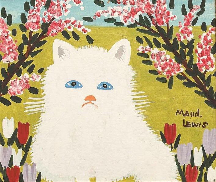 生于1903年的莫德·劉易斯被譽為加拿大“國寶”,其作品聞名全球。很多觀眾無法想象的是,莫德一生都在貧困和關(guān)節(jié)炎導(dǎo)致的疼痛中度過,關(guān)節(jié)炎使她的軀體和手都發(fā)生了變形。她沒有接受過正規(guī)的藝術(shù)教育或培訓(xùn),只能用隨處可見的材料來作畫,甚至在所住的小房子的外墻和內(nèi)部家具、餐具上作畫。因為身體健康所限,她終生沒有遠(yuǎn)行,她的作品中最為人所知的是她筆下的貓、漁船、野生動物,以及新省風(fēng)景如畫的海岸線。