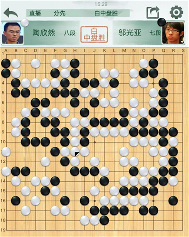 陶欣然執(zhí)白對陣鄔光亞。黑棋右邊攻擊白棋時候,連續(xù)失誤,反被白棋妙手吃通棋筋,黑已無法逆轉局面。有意思的是,賽前陶欣然遲到2分鐘被罰2分鐘,但絲毫不影響他獲勝。