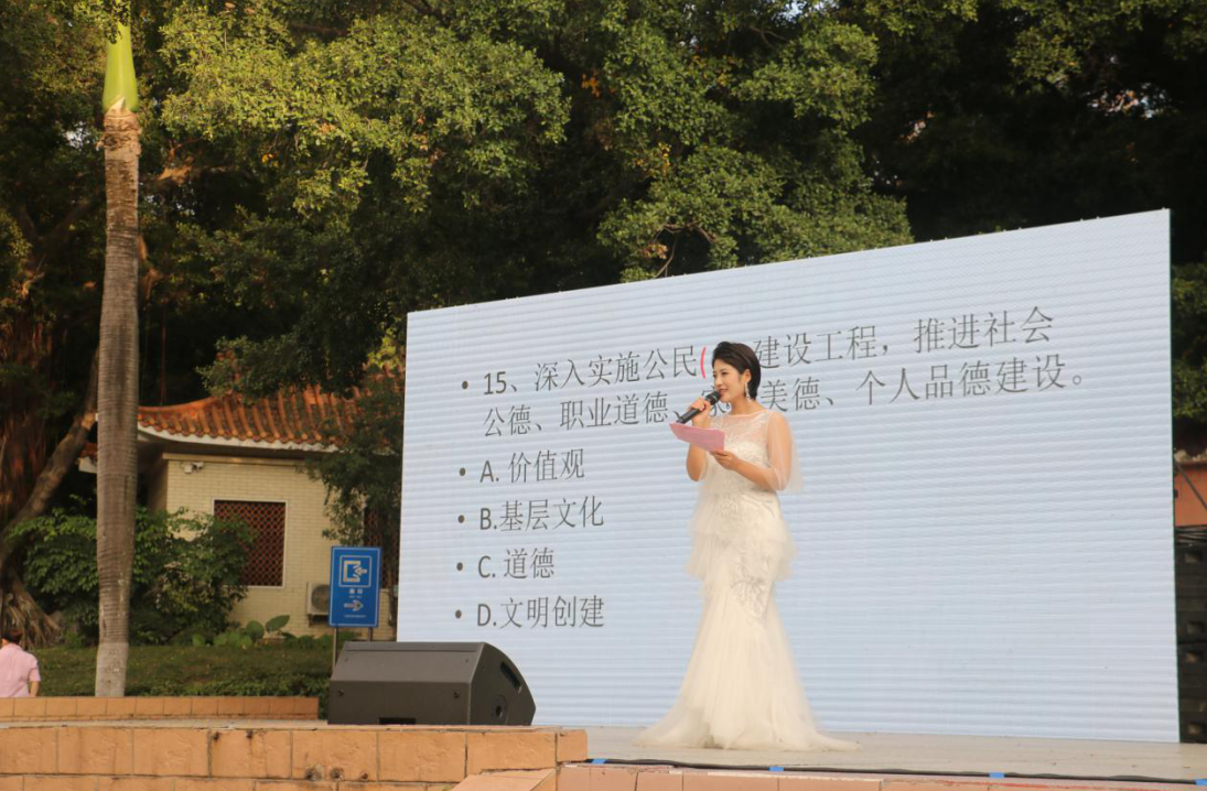演出在歡快的《永唱中國夢》歌舞中拉開了帷幕;懷舊老歌《紅歌聯(lián)唱》經(jīng)典又回味,越聽越喜歡;特色節(jié)目《李玉剛模仿秀》反串女聲,一開口驚艷全場……整場演出高潮迭起,精彩不斷,觀眾們無不拍手鼓掌,歡呼叫好。節(jié)目主持人在每個(gè)節(jié)目之間還以有獎(jiǎng)問答的形式,宣傳黨的十九屆五中全會(huì)的內(nèi)容,觀眾們踴躍參與,大家都說,這樣喜聞樂見的活動(dòng)親切,接地氣,不妨多來幾場。目前,西鄉(xiāng)街道黨工委正在打造“學(xué)習(xí)強(qiáng)國”示范街區(qū),“今天,你學(xué)習(xí)了嗎”已成為時(shí)尚的見面問候語。(孫善文)