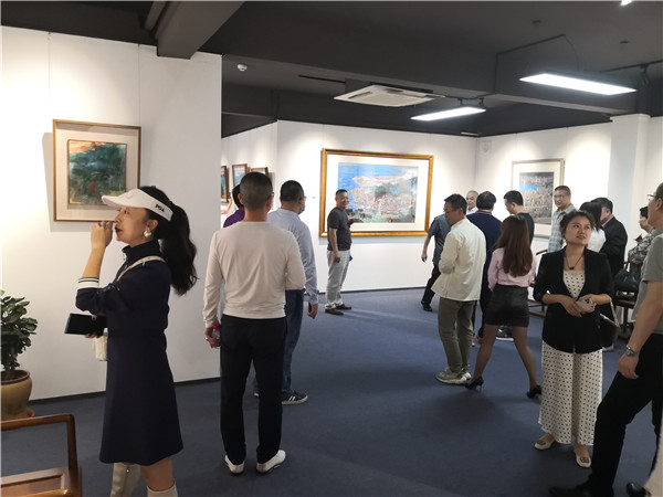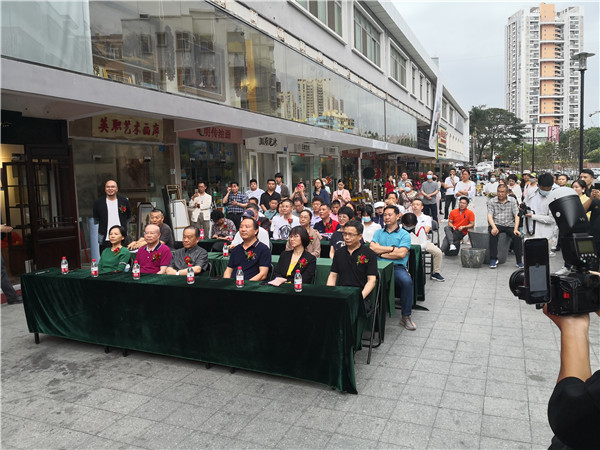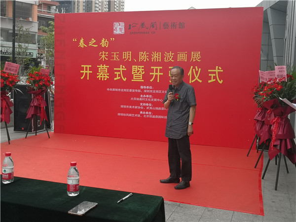 開幕儀式上,珍風(fēng)閣藝術(shù)館總經(jīng)理夏雨致辭,感謝一從嘉賓和書畫愛好者們的捧場。隨后,深圳市美術(shù)家協(xié)會名譽(yù)主席、深圳美術(shù)館原館長宋玉明先生致辭。他說,他來大芬村多次,一直關(guān)注大芬油畫村的發(fā)展和壯大,認(rèn)為大芬村為全國書畫走向市場開了先例。個(gè)人在此舉辦畫展是首次,感覺很有意義,是一次走向市場的實(shí)踐機(jī)會,值得珍惜和學(xué)習(xí),也歡迎大家批評指正。在現(xiàn)場,宋玉明老師還回答了主持人的提問。他謙虛地說,這次和陳湘波主席的聯(lián)展,有陳主席的花鳥和自己的城市山水,可以雅俗共賞。陳湘波老師因參加“兩會”未能出席開幕儀式,但在會后及時(shí)趕到現(xiàn)場,表達(dá)自己對來賓的感謝和自己對本次畫展組織的重視和支持。