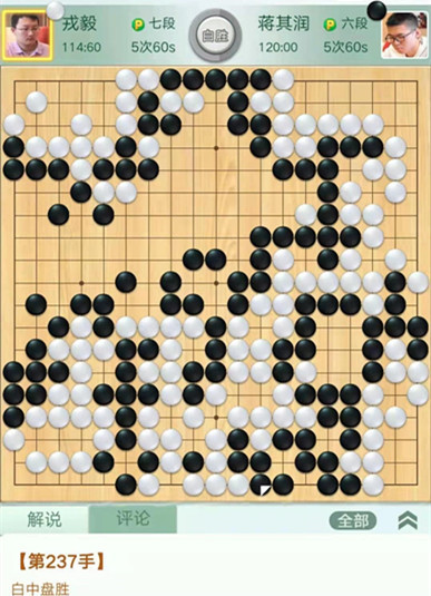 戎毅執(zhí)白對(duì)陣蔣其潤(rùn)。開局白取地中央黑模樣巨大,白淺消后黑棋攻擊不當(dāng),被白活出兩塊棋后白棋領(lǐng)先。之后黑棋左下棄子圍空又虧損,白棋以較大優(yōu)勢(shì)獲得勝利。