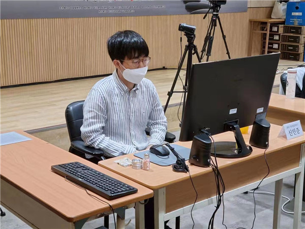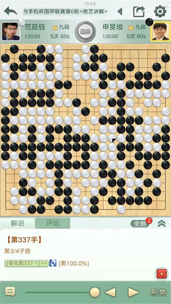 一臺申旻俊執(zhí)黑對陣世界冠軍范廷鈺。開局下邊白棋攻擊手法不當(dāng),黑處理好后局面領(lǐng)先。中盤黑棋在左邊計算精準(zhǔn),下出絕妙手段,在白棋空里出棋后優(yōu)勢擴大,之后黑棋穩(wěn)扎穩(wěn)打?qū)?yōu)勢保持至終局獲勝。