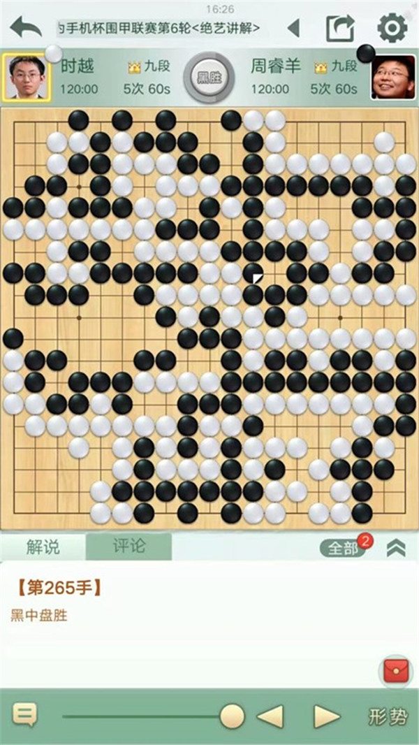 四臺時越執(zhí)白對陣世界冠軍周睿羊。中盤白棋侵消黑棋左上大模樣,黑棋付出很大代價強殺形成打劫。白棋劫爭中不夠細(xì)膩沒有擴大戰(zhàn)果而是聯(lián)絡(luò)成活,局面白稍有利。之后白棋左下連續(xù)下出緩手后局面接近。右下角黑棋二路夾試白應(yīng)手時白棋嚴(yán)重失誤,被黑棋奪走角地后局勢逆轉(zhuǎn)。