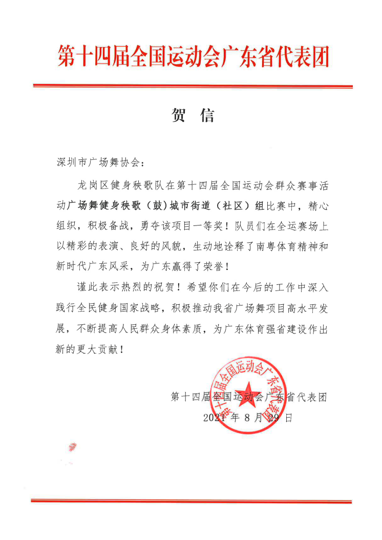 8月29日,第十四屆全國運(yùn)動會群眾展演廣場舞健身秧歌(鼓)項(xiàng)目公布競賽結(jié)果,由深圳市文化廣電旅游體育局和深圳市廣場舞協(xié)會組織代表廣東省參賽的隊(duì)伍,以一套整齊劃一、剛?cè)岵?jì)的自選套路《我的祖國》戰(zhàn)勝了多個(gè)省市的傳統(tǒng)秧歌強(qiáng)隊(duì),得到最高名次,獲得了含金量十足的城市街道(社區(qū))組一等獎(jiǎng)。