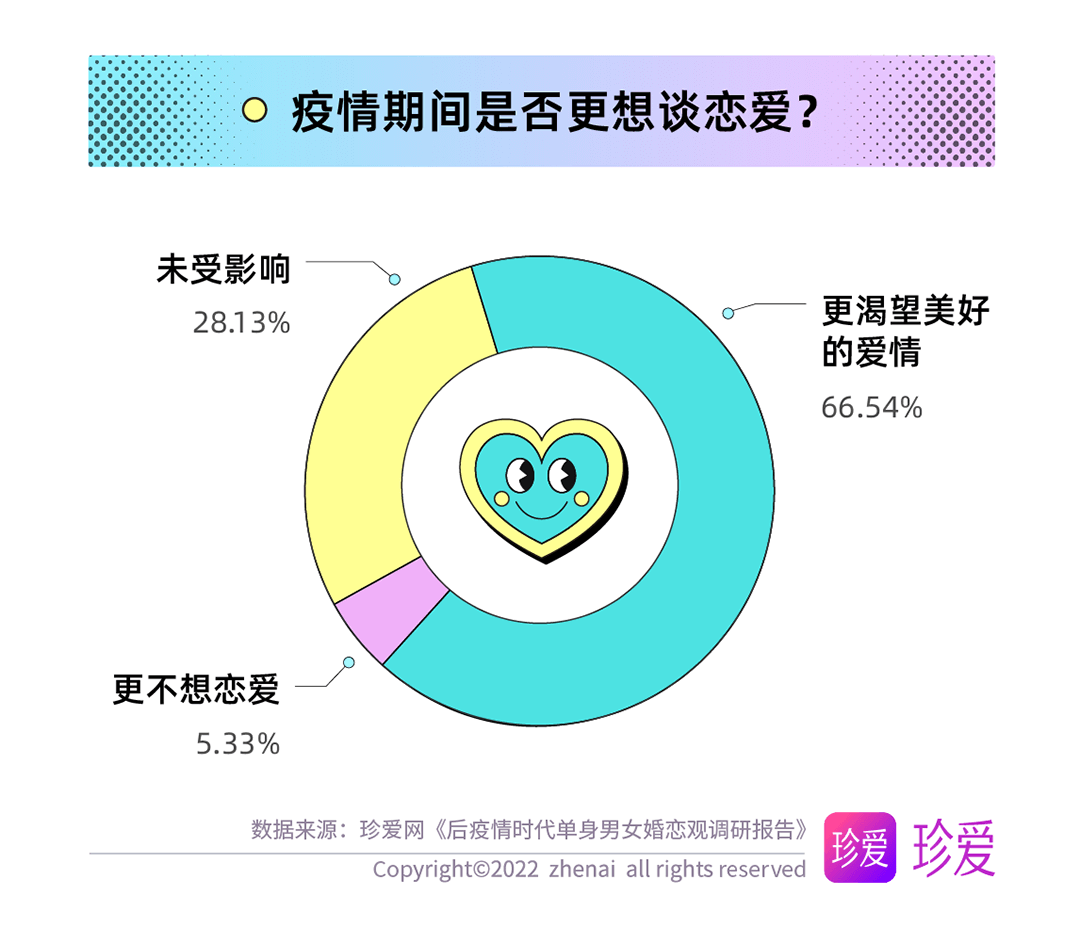 數(shù)據(jù)顯示,近七成人經(jīng)過疫情后更渴望美好的愛情;人們的脫單進(jìn)度也受到了疫情影響,超七成人使用社交軟件增加戀愛幾率;超八成人的擇偶標(biāo)準(zhǔn)在經(jīng)歷疫情后發(fā)生變化,最看重對方的性格、健康狀態(tài)及價值觀;近半數(shù)人對異地戀的接受程度下降;性格合拍、真心相愛、三觀相合成為人們心中理想婚姻的最重要因素。