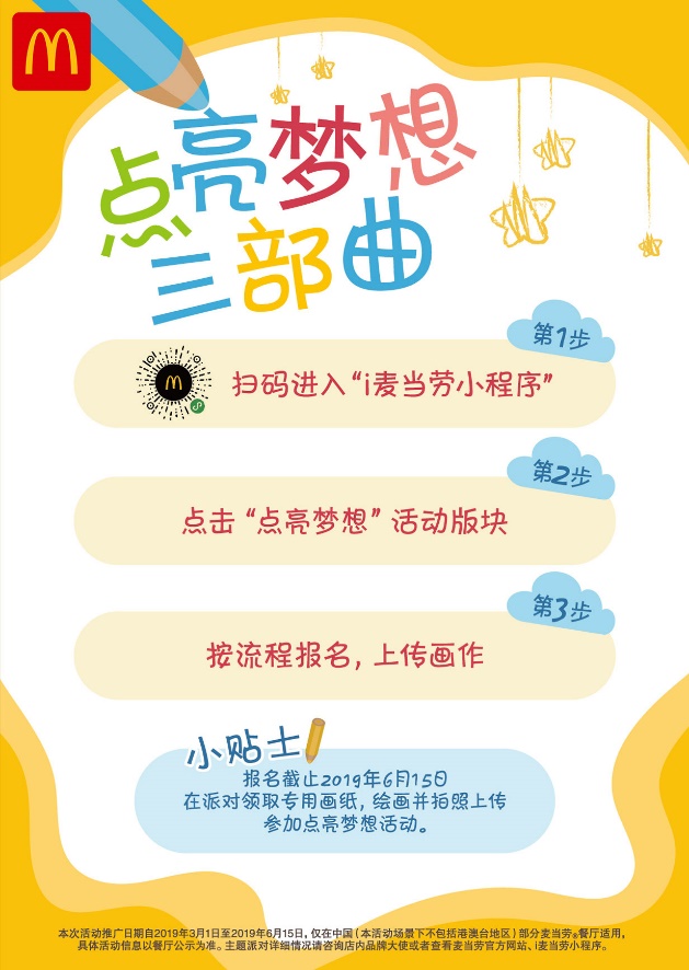 今年麥當勞邀請3-11歲兒童來餐廳,用畫筆描繪自己的夢想。顧客可以通過“i麥當勞“微信小程序相關(guān)頁面報名。 在麥當勞品牌大使的帶領(lǐng)下,孩子們將體驗“說出夢想”、“跳出夢想”、“畫出夢想”等環(huán)節(jié),并且享用美食及玩具。孩子們還將獲得專屬的《點亮夢想榮譽證書》。