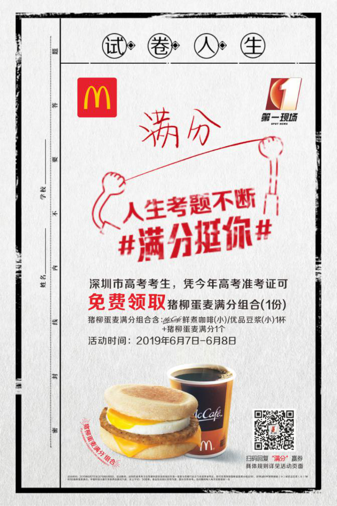 麥當勞早餐攜手百萬網(wǎng)友,預祝高考考生“滿分”考試,以“滿分”的早餐,迎接每天“滿分”生活。
