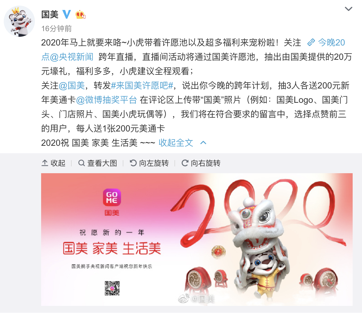 跨年就是要大聲說出你的心愿,趕快@國美幫你圓夢?;顒赢?dāng)天,國美官方微博將與央視新聞同步抽獎,2019年12月31日17點(diǎn)起至2020年1月1日不同時(shí)間段抽取多項(xiàng)大獎,其中最高獎項(xiàng)為價(jià)值2020元國美美通卡1張。