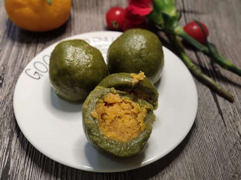 實際上,如果單純用艾草做青團子,蒸熟后顏色暗沉偏黃,不一定特別好看,所以也有粵菜師傅發(fā)明一種改良的做法:用菠菜汁和艾葉汁混合,青團子就呈現(xiàn)鮮綠的顏色。餡料方面,除了可以用最傳統(tǒng)的花生糖餡料,也可以用很多年輕人喜愛的咸蛋肉松餡,咸甜任君選擇。