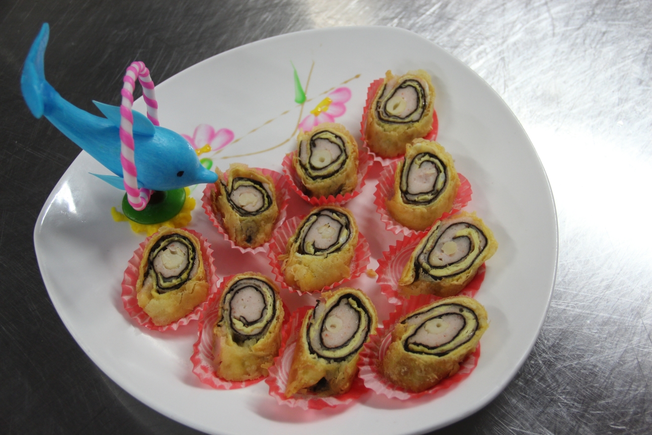 做法:將鮮蝦去殼拆肉,用菜刀輕輕碾壓之后,加入少量精鹽拌勻,于鋁制小碗中不停搓攪。打蝦膠時手必須朝同一方向攪拌,這樣蝦肉才會粘連起膠;否則卻可能破壞粘度,口感亦不夠爽脆。然后,打碎雞蛋,于平底鍋中烙出一塊塊金黃色雞蛋皮,并連同大片紫菜各各切成正方形片狀。將紫菜片放于雞蛋皮上,取蝦膠均勻涂抹于紫菜表面,蓮子整齊擺放于一端,以其為圓心卷裹成圓條。整條放入中溫油鍋,微炸至表面金黃即撈起瀝油,斜刀切成厚片直接裝盤。