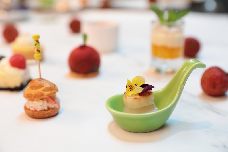酒店餅房廚師長(zhǎng)趙偉匠心獨(dú)運(yùn),使荔枝和傳統(tǒng)下午茶碰撞出別樣風(fēng)情:芒果恰到好處的酸甜邂逅荔枝的宜人甘美,香芒荔枝慕斯杯里滿載的不就是夏天的專屬甜蜜;芝士蛋糕的醇厚滋味被荔枝的清爽巧妙平衡,多層次的口感讓人無(wú)限回味;當(dāng)俏皮可人的荔枝被加入傳統(tǒng)甜品楊枝甘露,搭配冰涼爽口的荔枝雪芭,是妙趣橫生的獨(dú)特味覺(jué)體驗(yàn);法式焦糖燉蛋和荔枝的融合,恍若天成,是中西合璧的典范;日本帶子和荔枝的組合聽(tīng)來(lái)不可思議,只有親試方能體會(huì)海陸鮮甜交匯的真意。