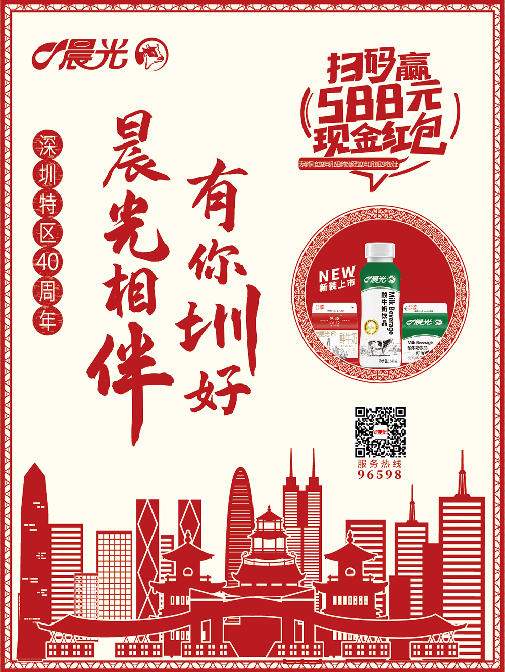 見圳客戶端·深圳新聞網(wǎng)2020年8月25日訊 作為深圳本土的國營乳制品公司,晨光乳業(yè)以“深圳特區(qū)40周年,晨光相伴,有你圳好”為主題,致敬深圳經(jīng)濟(jì)特區(qū)建立40周年。作為一家“深圳老字號”品牌企業(yè),晨光乳業(yè)以40周年為契機(jī),推出全新升級包裝的240g酸牛奶飲品以及掃碼贏588元紅包等多個主題活動,在與千萬深圳市民分享晨光40年的喜悅之情的同時共慶深圳經(jīng)濟(jì)特區(qū)成立40周年!