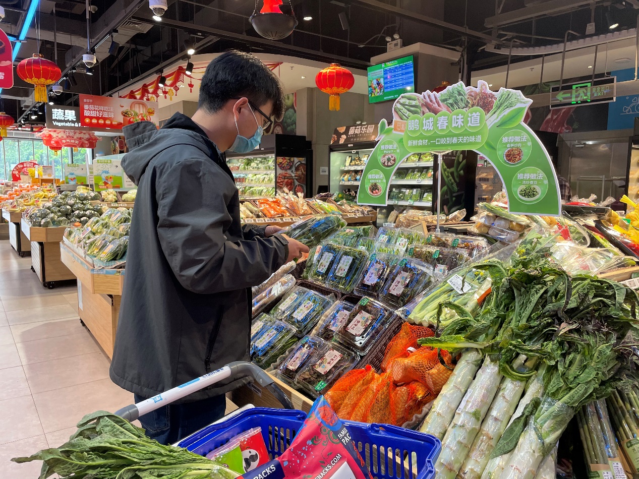 消費(fèi)者通過(guò)手機(jī)下單購(gòu)買(mǎi)春菜,盒馬小二正在揀貨