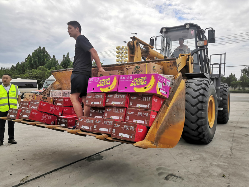 鏟車接力運(yùn)送賑災(zāi)愛(ài)心水果。