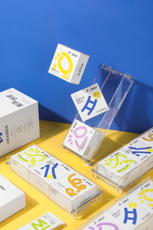 作為和Seesaw聯(lián)名的禮盒,為了增加互動感和cp感,喜茶將“偷顆月亮送給你”的主題在外包裝設(shè)計上加以延展,設(shè)定了“互偷月亮”的概念,將靈感注入外包裝設(shè)計中以圖形上的方圓結(jié)合、顏色上的簡約和諧,以及喜茶和Seesaw特有元素的交相呼應(yīng),為消費者帶來兼具互動性、包容性的視覺體驗。方圓的簡約圖形結(jié)合馬克筆筆跡式的設(shè)計元素,給人以想象空間。同時,結(jié)合代表“夜晚”的“藍(lán)色”和代表“月亮”的“黃色”這兩種顏色系統(tǒng)的運用,進(jìn)一步對主題加以呈現(xiàn)。禮盒整體上則突破傳統(tǒng)的橫放型禮盒式樣,采用直立型包裝,令人耳目一新。每一處設(shè)計,都延續(xù)了喜茶靈感。