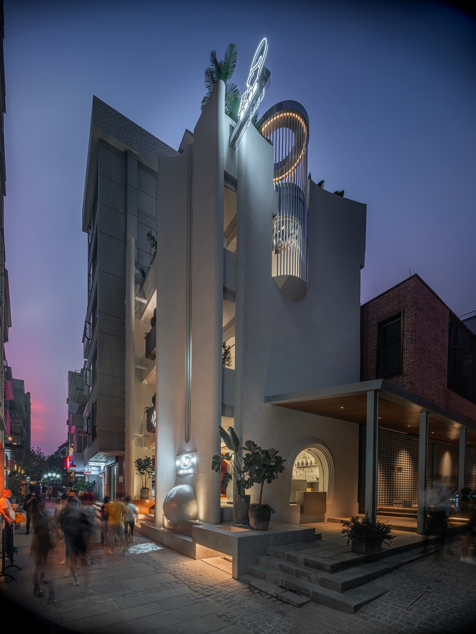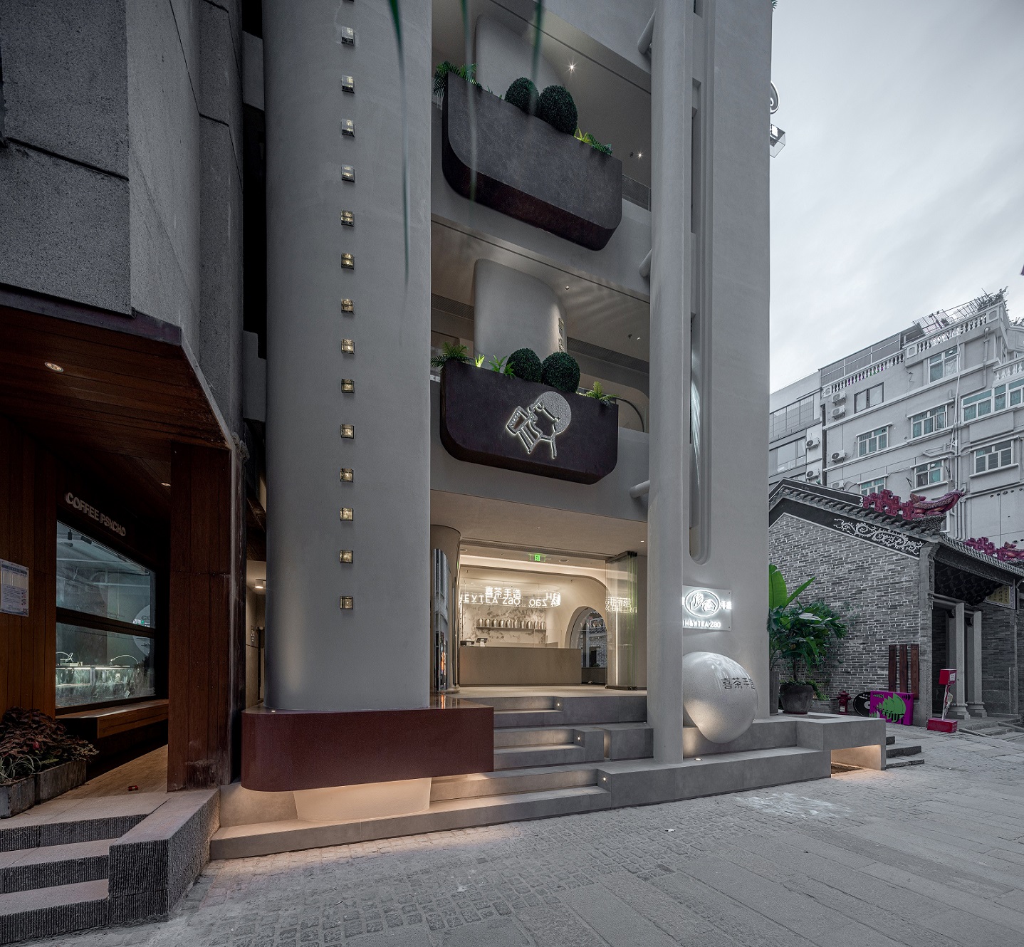 門店整體建筑設計是從幾何圖形中抽象出簡潔線條,改變原先外立面單一的線性結(jié)構(gòu),突破對于建筑形態(tài)的固有思維。外立面則選用水紋氣泡玻璃磚、做舊的復古外墻肌理漆,二、三樓陽臺花槽由銹鐵材質(zhì)制成,強調(diào)歷史感。同時,整體建筑中有一道空凹槽,自上而下營造水流不息的視覺感、靈動感,形成動靜結(jié)合的整體樓面。