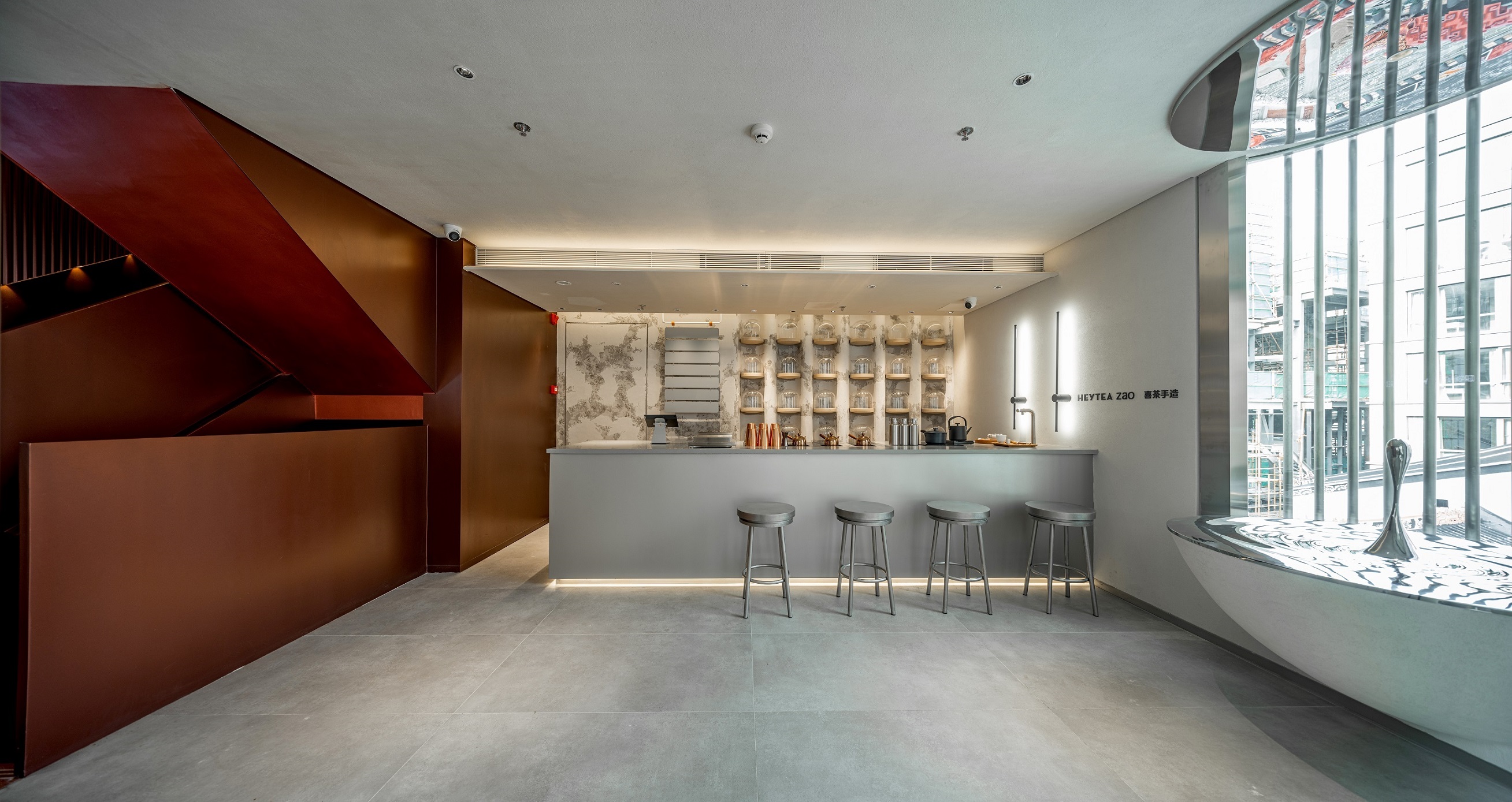 在內(nèi)部設計上,喜茶同樣以創(chuàng)新的功能空間設置和突破性設計,呼應每一樓層的手造主題,升級了消費者的空間體驗。喜茶將一樓正門墻體改造為玻璃移門,塑造出通透的門店空間;變封閉窗戶為開放的門,讓顧客看得見手造產(chǎn)品的全過程。此外,在用色與材質(zhì)搭配上,門店內(nèi)部整體采用嶺南復古紅與現(xiàn)代極簡白搭配,做舊復古肌理漆與現(xiàn)代化金屬材質(zhì)呼應,不僅有效進行功能分區(qū),還體現(xiàn)歷史感與現(xiàn)代感的對比、融合。
