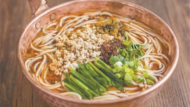 酥肉小鍋米線用小銅鍋來(lái)煮,瘦肉末是標(biāo)配,還要加上云南人自家腌制的酸菜才夠勁兒。