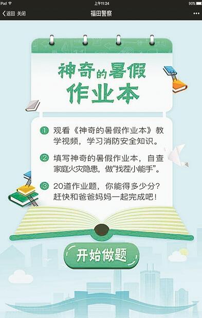 據(jù)介紹,完成這個作業(yè)并不難,只需分三步,第一步是關(guān)注微信公眾號“福田警察”觀看視頻,第二步是掃描二維碼直達(dá)《神奇的暑假作業(yè)本》,第三步是在家長陪同下認(rèn)真完成家庭火災(zāi)隱患排查。當(dāng)然,最重要的是填寫信息欄,將火災(zāi)隱患反饋到后臺?!白鳂I(yè)本”打開后,各種常見的消防隱患會一一展現(xiàn)在眼前。說是作業(yè),它其實更像一個假期實踐,通過生動的視頻和有針對性的問答,取代過去紙質(zhì)版消防安全宣傳冊的作用。