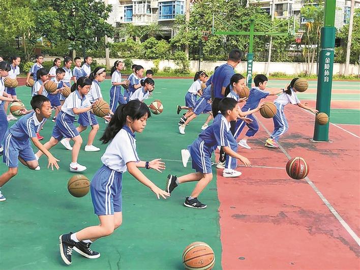 6月的天空在大雨過(guò)后碧藍(lán)如洗?;@球場(chǎng)上,在體育教師有節(jié)奏的口令下,孩子們展示出拿手的籃球“絕技”,雙手擊掌拋接球、胯下拍球、行進(jìn)間運(yùn)球等讓人眼花繚亂。