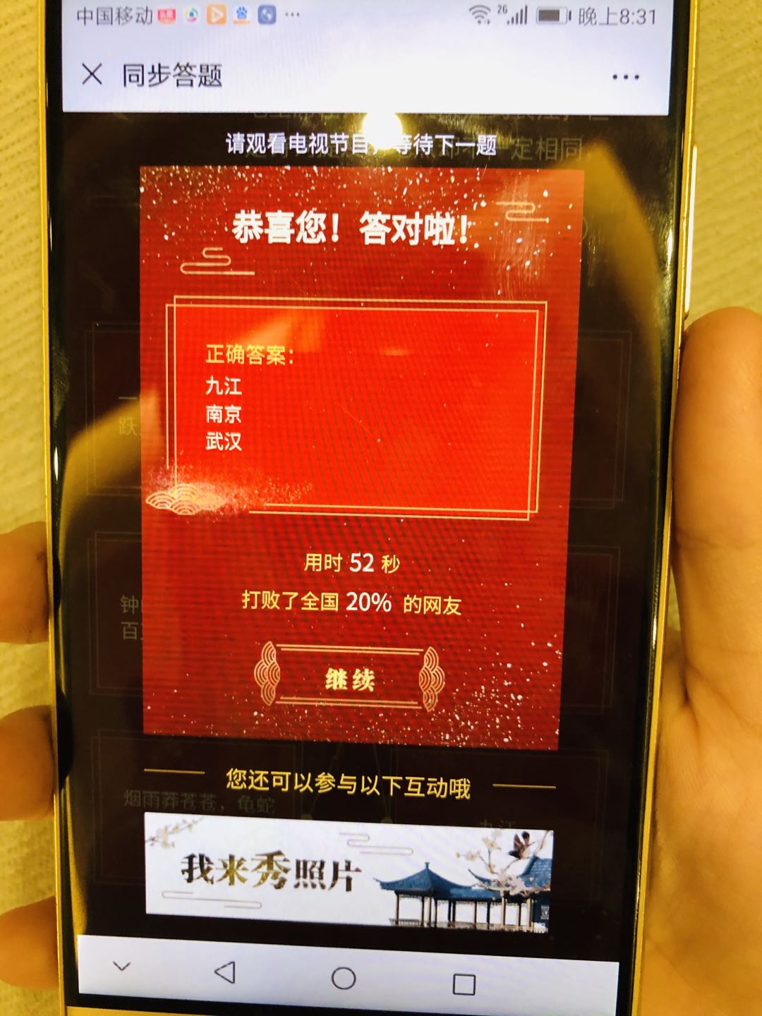 看電視:詩(shī)詞大會(huì)、中國(guó)故事。(因?yàn)殛?yáng)陽(yáng)很喜歡董卿,所以比較喜歡看這兩個(gè)節(jié)目,尤其是詩(shī)詞大會(huì)可以掃碼參與答題,每次答對(duì)題目都會(huì)信息若狂的。為此每天會(huì)背古詩(shī),掃碼參與詩(shī)詞大會(huì)答題。)