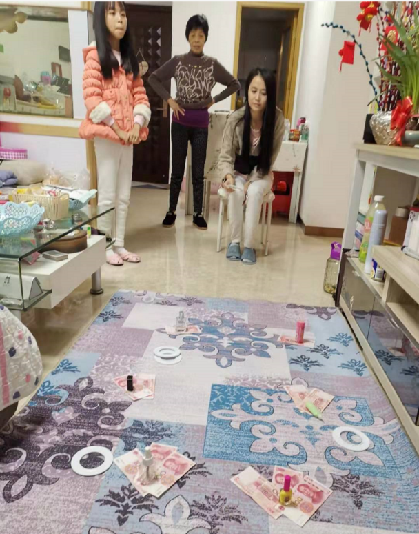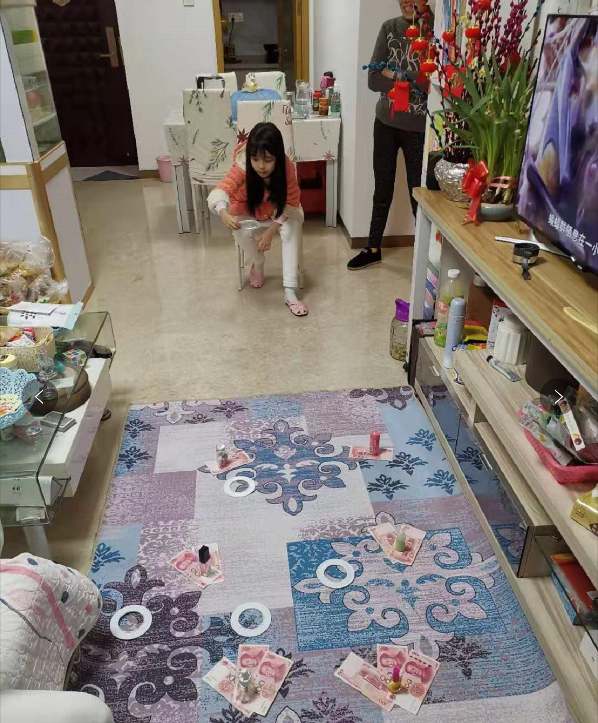 娃兒爸,在家里擺起地攤套圈圈。開始還賺錢,可是,一男難敵三女啊,在三位女豪杰,勇創(chuàng)新規(guī)則的前提下,地毯上的前兩排的“禮物”被她們?nèi)俊皻灉纭?。雖然是虧本生意,但是滿屋子的歡笑和雀躍,地攤老板還是很開心的。