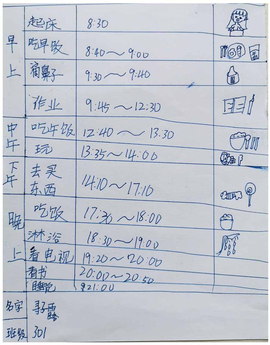 凡事預(yù)則立,寒假第一天,就與娃一起商量,寒假怎么過,每天時間怎么安排,形成了如左圖的作息時間表,可是沒想到疫情爆發(fā),作息時間表所有外出游玩的時間全部取消了,娃兒開始還很不理解,不過隨著疫情的發(fā)展,也能理解了。另外,起床時間也往后推遲了1小時了。