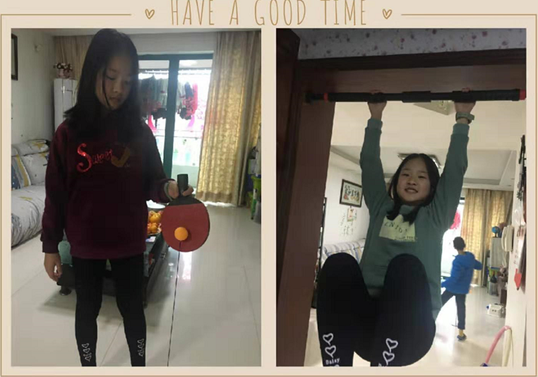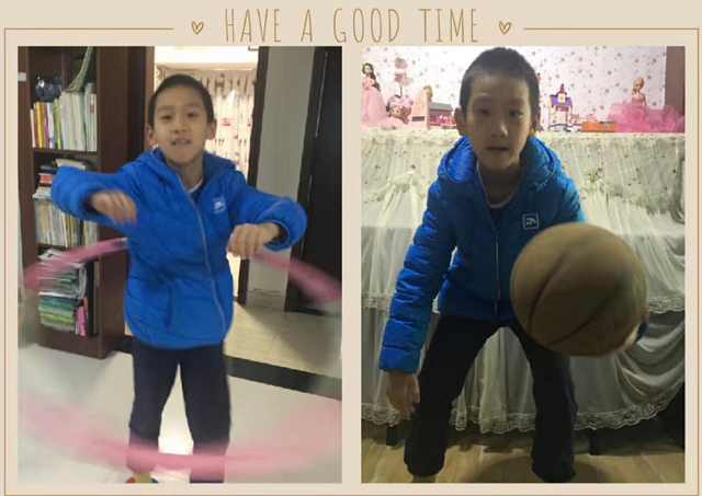當(dāng)然運(yùn)動(dòng)也是必不可少的啦,要使身體有較強(qiáng)的抵抗力,我們除了按時(shí)作息,還要運(yùn)動(dòng)起來(lái),所以每天都有運(yùn)動(dòng)項(xiàng)目,跳繩、呼拉圈、單杠、室內(nèi)乒乓球輪翻上陣,籃球也拍了下,但極少,為了不能給樓下鄰居帶來(lái)噪音,弟弟已經(jīng)極力控制看書(shū)拍球時(shí)間了。還有姐姐還做了有意義的事情,給我們一線的醫(yī)生和患病的人兒錄了鼓勵(lì)的視頻。