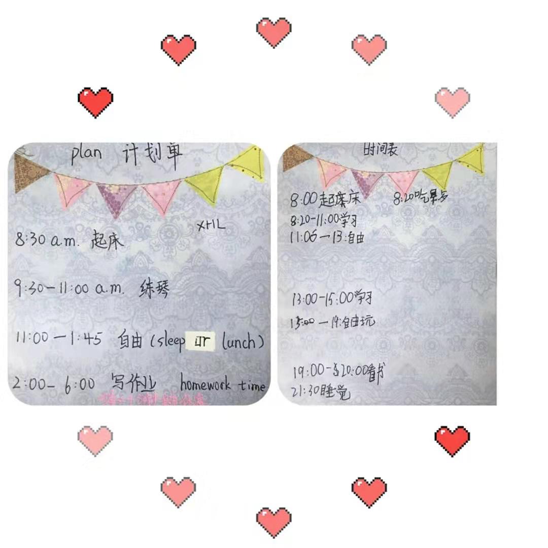 因?yàn)樾鹿谝咔椋覀冊(cè)诔跞蛷睦霞液馅s回了深圳,想著就算是要隔離,我們也能提前自行先隔離,到家后將從老家過(guò)來(lái)的所有衣物第一天就全部清洗,將家中消毒清潔,整整忙了一天。當(dāng)天晚上我們便與孩子們開(kāi)了一個(gè)家庭會(huì)議,告知兩個(gè)孩子我們將要面對(duì)的問(wèn)題,不能出家門,要好好待在家中,但是除了玩耍、電視,我們需要合理安排學(xué)習(xí)的時(shí)間,我們讓孩子們自己做了一份自己的時(shí)間表。