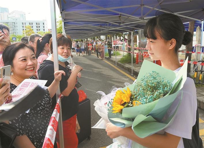 家長(zhǎng)帶著鮮花來(lái)到寶安中學(xué)考場(chǎng)門(mén)口迎接考生。深圳商報(bào)記者陳錫明攝