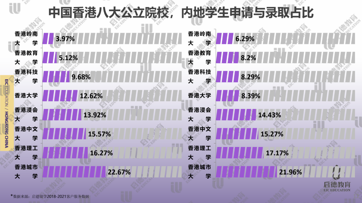啟德留學(xué)2018-2021客戶服務(wù)數(shù)據(jù)顯示,申請(qǐng)香港城市大學(xué)(22.67% )、香港理工大學(xué)(16.27% )和香港中文大學(xué)(15.57% )的占比穩(wěn)居前三,這三所大學(xué)學(xué)術(shù)排名優(yōu)秀,專業(yè)設(shè)置全面,囊括了內(nèi)地學(xué)生赴港求學(xué)的熱門學(xué)科——商科、理工科、人文與社會(huì)科;香港浸會(huì)大學(xué)因其在傳媒類和商科類的專業(yè)優(yōu)勢(shì),申請(qǐng)占比(13.92% )也較高。在錄取方面,71.08%的學(xué)生被QS排名前100的5所名校(香港大學(xué)、香港科技大學(xué)、香港中文大學(xué)、香港城市大學(xué)、香港理工大學(xué))錄取。其中,香港大學(xué)(8.39% )和香港科技大學(xué)(8.29% )對(duì)于學(xué)生院校背景方面的要求較高,錄取的占比相對(duì)較小。香港中文大學(xué)(15.27% )、香港城市大學(xué)(21.96% )、香港理工大學(xué)(17.17% )對(duì)院校背景普通,但其他條件出色的學(xué)生給予更多面試和錄取的機(jī)會(huì),這三所學(xué)校每年錄取的學(xué)生占比超過50%。