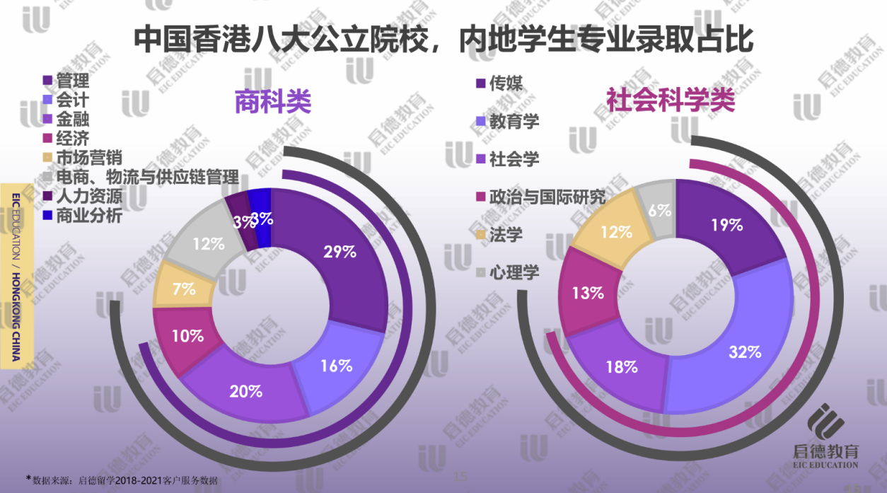 在社會(huì)科學(xué)類學(xué)科的細(xì)分專業(yè)中,教育學(xué)(32% )、傳媒(19% )和社會(huì)學(xué)(18% )的錄取占比較高。由于教育類專業(yè)在內(nèi)地就業(yè)形勢(shì)好,香港院校不僅教育學(xué)排名靠前,還擁有適合內(nèi)地學(xué)生的中文教育及對(duì)外漢語教育等課程,教育學(xué)專業(yè)在文科生中比重一直居于首位。隨著新媒體行業(yè)的崛起,處于亞洲龍頭地位的香港傳媒專業(yè)也是倍受歡迎。而“公考熱”的持續(xù)使得希望提升學(xué)歷背景的學(xué)生,會(huì)考慮繼續(xù)深造社會(huì)學(xué)、政治與國際研究此類課程。