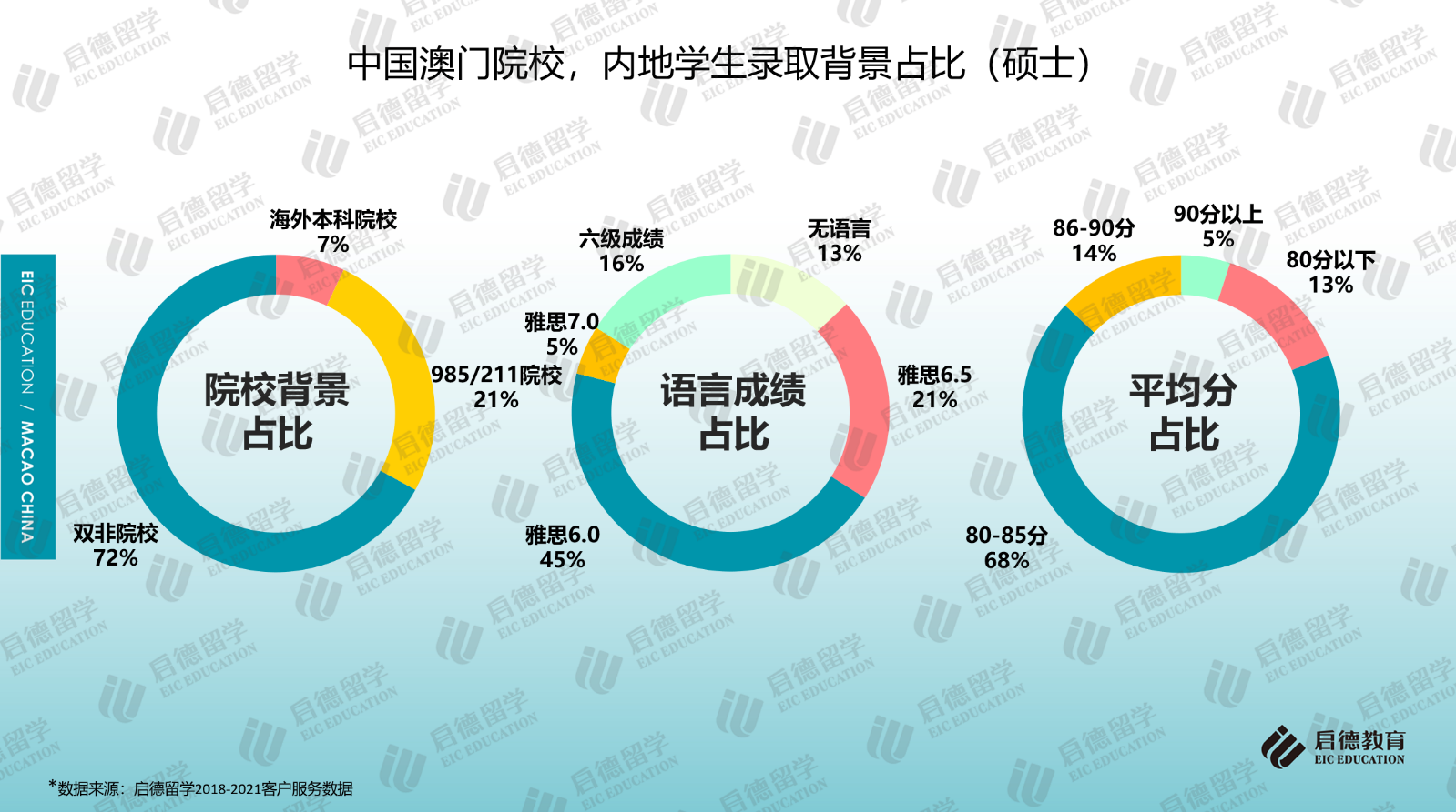 本科錄取中,澳門大學(xué)的要求較高,應(yīng)屆高考生申請(qǐng)人高考成績(jī)要達(dá)到一本線;碩士錄取中,只有澳門大學(xué)和澳門旅游學(xué)院要求碩士申請(qǐng)學(xué)生提交英語(yǔ)成績(jī),雅思6分為澳門大學(xué)和澳門旅游學(xué)院的語(yǔ)言門檻要求,澳門大學(xué)碩士申請(qǐng)也可接受430分以上六級(jí)和TEM4/8成績(jī);其它院校的大多數(shù)專業(yè)對(duì)英語(yǔ)成績(jī)無(wú)硬性要求。啟德留學(xué)2018-2021客戶服務(wù)數(shù)據(jù)顯示,2021年碩士錄取學(xué)生中,45%達(dá)到雅思6分的門檻成績(jī),雅思成績(jī)6.5分以上達(dá)到26%,16%的學(xué)生只提供了合格的六級(jí)成績(jī),13%為無(wú)語(yǔ)言錄取;七成以上的碩士錄取學(xué)生來(lái)自雙非院校;GPA在80分以上的占比為87%。