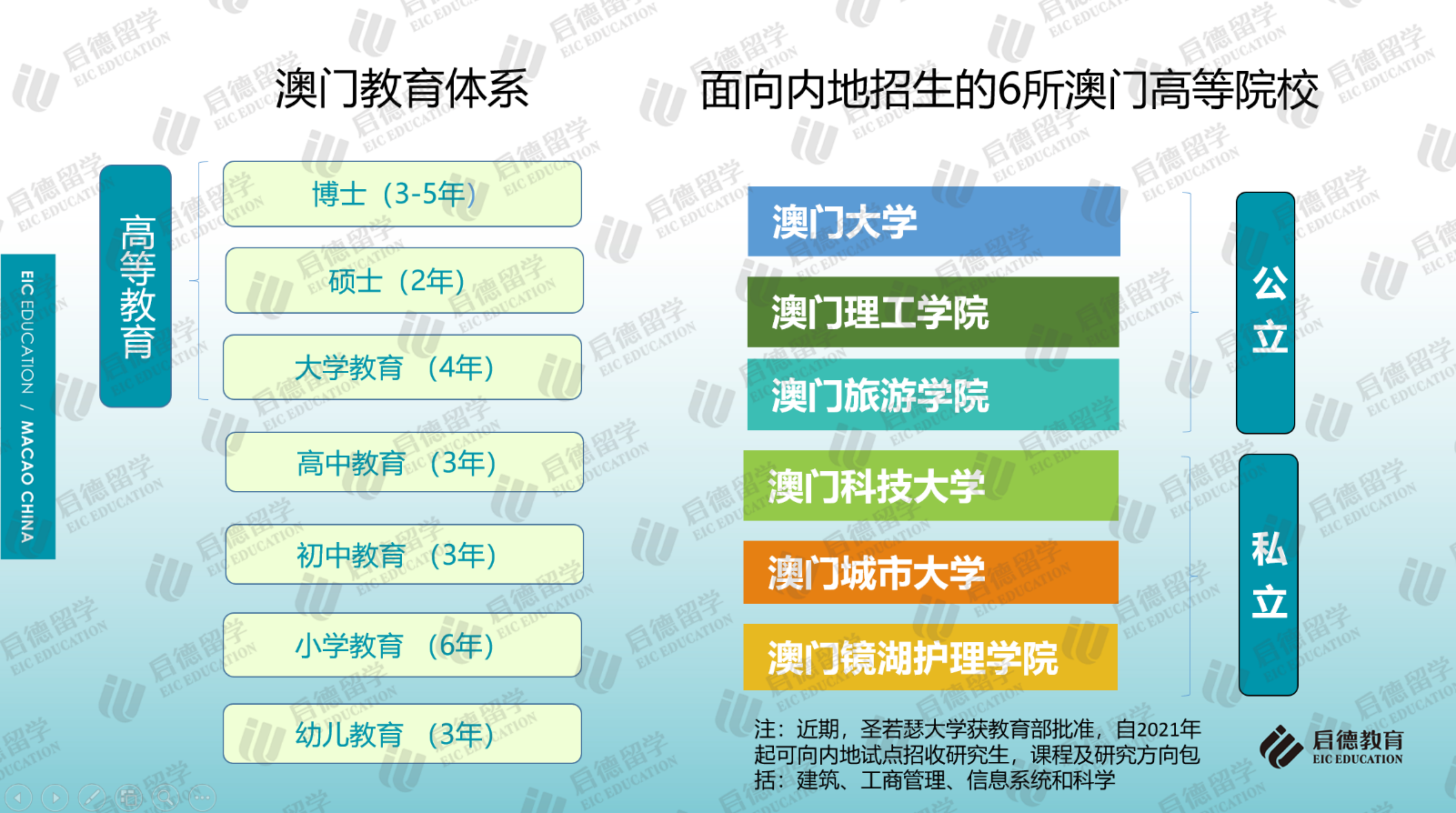 作為中西文化交匯的國(guó)際旅游城市,中國(guó)澳門的輕工業(yè)、旅游業(yè)、酒店業(yè)和娛樂(lè)場(chǎng)使其成為中外游客青睞的旅游度假勝地。澳門與香港同樣都具有獨(dú)特的地緣優(yōu)勢(shì),既有中國(guó)文化的根基,又融會(huì)貫通了歐美教育的優(yōu)勢(shì),中文、葡文、英文學(xué)制并存的多語(yǔ)言教學(xué)與多元文化交融的國(guó)際化環(huán)境,為學(xué)生提供了開闊的國(guó)際視野和學(xué)術(shù)氛圍,也為當(dāng)?shù)馗叩冉逃陌l(fā)展創(chuàng)造了良好的條件。目前,澳門大學(xué)、澳門理工學(xué)院、澳門旅游學(xué)院、澳門城市大學(xué)、澳門鏡湖護(hù)理學(xué)院、澳門科技大學(xué)等6所高校獲教育部批準(zhǔn)可面向內(nèi)地招收本科生及研究生,圣若瑟大學(xué)獲教育部批準(zhǔn)自2021年起可面向內(nèi)地試點(diǎn)招收研究生。
