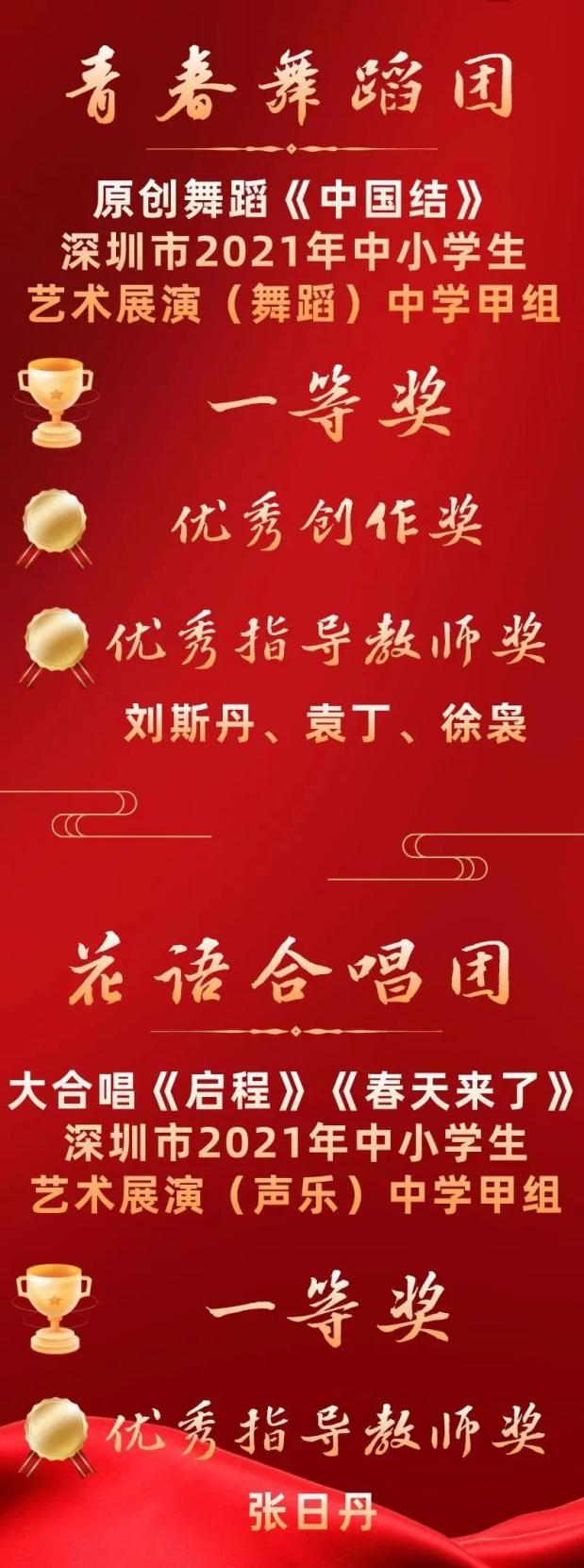 二實(shí)青春舞蹈團(tuán)以原創(chuàng)作品《中國結(jié)》在全市各區(qū)以及市直屬學(xué)校選拔出來的37個節(jié)目中脫穎而出,獲得全場最高分!接下來,青春舞蹈團(tuán)將代表深圳市參加省賽,有望沖擊全國決賽!此外,二實(shí)花語合唱團(tuán)也憑借大合唱《啟程》《春天來了》榮獲深圳市2021年中小學(xué)藝術(shù)展演(聲樂)中學(xué)甲組一等獎。劉斯丹、袁丁、徐裊、張日丹等老師榮獲優(yōu)秀指導(dǎo)老師獎。