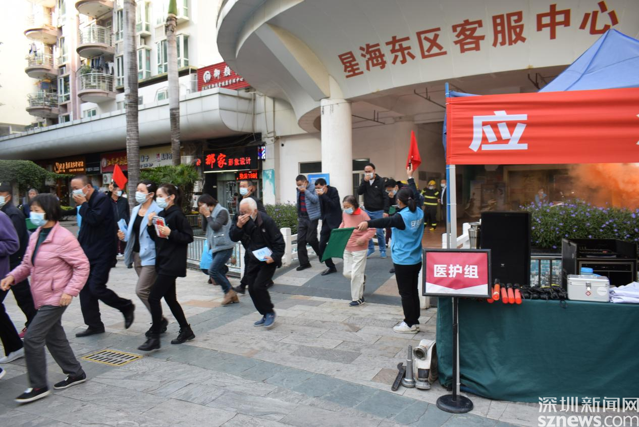 演練情景設(shè)定為巡查人員發(fā)現(xiàn)火情,第一時(shí)間向社區(qū)安全相關(guān)負(fù)責(zé)人匯報(bào),安保處立刻報(bào)警并啟動(dòng)消防應(yīng)急預(yù)案。隨后火警警報(bào)驟響,樓道內(nèi)冒出濃煙,疏散演練正式開始。居民們?cè)诠ぷ魅藛T的指揮下,用口罩、衣服等捂口鼻,屈膝彎腰沿著既定的疏散路線,迅速向安全區(qū)域撤離。隨后社區(qū)消防員趕赴現(xiàn)場(chǎng),使用高壓水槍撲滅火災(zāi),解除警報(bào)。演練結(jié)束后,社區(qū)還組織居民參加安全體驗(yàn)活動(dòng)。