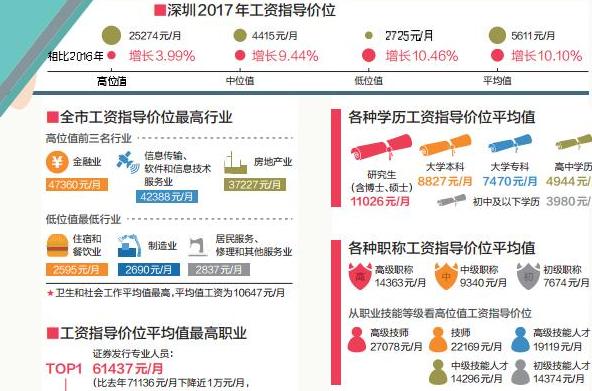 由深圳市人社局發(fā)布的《2017年深圳市人力資源市場(chǎng)工資指導(dǎo)價(jià)位》顯示,2017年,深圳工資指導(dǎo)價(jià)位平均值為5611元/月,比去年上漲10.10%。
