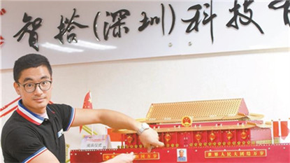在8平方米的展臺上,1.2米寬、1米左右高的天安門雄壯威武,護旗手、閱兵戰(zhàn)士、坦克、裝甲車、吉普車、升旗臺等一應俱全、栩栩如生