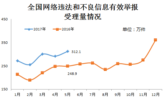 5月份,各地網(wǎng)信辦各網(wǎng)站深入貫徹落實2017年全國網(wǎng)絡(luò)舉報工作會議暨第三批百家網(wǎng)站公布舉報受理方式會議精神,同時在“六一”國際兒童節(jié)到來前,進(jìn)一步加大對網(wǎng)上違法和不良信息,特別是淫穢色情等嚴(yán)重危害青少年身心健康有害信息的處置力度,受理違法和不良信息有效舉報312.1萬件,環(huán)比、同比分別增長約7.1%和25.4%。