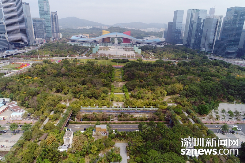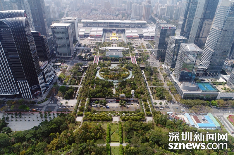 2018年,深圳新聞網(wǎng)無人機(jī)拍攝下的福田中心區(qū)會展中心附近建筑群及綠地