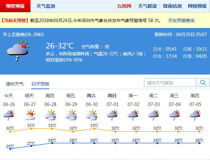 深圳市氣象臺預計明天多云,有陣雨或雷陣雨;26-32℃;南風2-3級;27-30日天氣炎熱到酷熱,午后易發(fā)局地短時熱雷雨,最高氣溫33-34℃,局地35℃或以上,請市民做好防暑降溫,戶外活動時多補充水分,長時間戶外工作者,感到不適時,應到陰涼處休息,另外,午后易發(fā)生局地短時雷雨,及時關(guān)注最新氣象預報預警信息,避免對出行或活動照常影響。