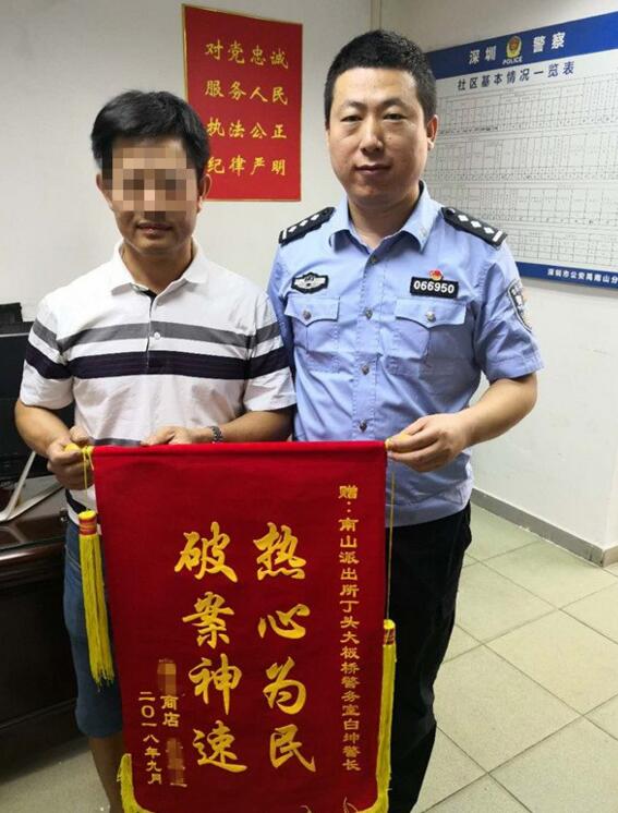 9月12日下午,事主唐先生親自帶著一面寫有"破案神速,熱心為民"的錦旗到丁頭大板橋警務(wù)室,對南山派出所丁頭社區(qū)民警及巡防員及時為其找回被盜手機(jī)表示感謝和贊揚(yáng)。(記者 羅典 通訊員 龍威 唐婷)