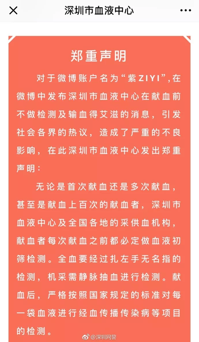 @深圳市血液中心發(fā)出鄭重聲明:無論是首次獻血者還是多次甚至是上百次的獻血者,每次獻血都必須做初篩檢測,全血要經(jīng)過扎左手無名指的檢測,機采需靜脈抽血進行檢測。獻血后,嚴(yán)格按照國家規(guī)定的標(biāo)準(zhǔn)對每一袋血液進行經(jīng)血傳播傳染病等項目的檢測。