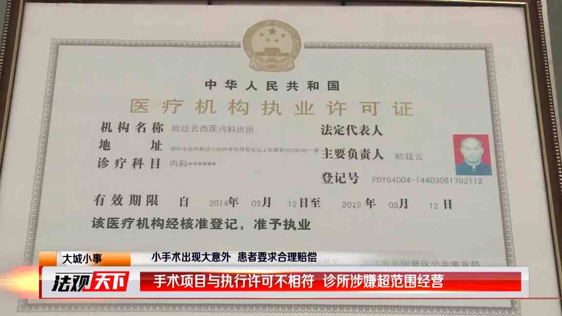 隨后,記者和醫(yī)調(diào)委吳毅主任來到了歐廷云診所,由于周女士身體尚未恢復(fù),周女士丈夫張先生來到了這家位于光明新區(qū)上石家村的診所。此時(shí)負(fù)責(zé)人并未在店內(nèi),記者在店里掛出的《醫(yī)療機(jī)構(gòu)執(zhí)行許可證》看到,該診所的診療科目為內(nèi)科,而取環(huán)手術(shù)卻是婦科項(xiàng)目,換言之,該診所涉嫌超范圍經(jīng)營。隨后,吳主任電話與診所負(fù)責(zé)人取得了聯(lián)系。負(fù)責(zé)人表示,涉事醫(yī)生并非診所醫(yī)生,而是從其它診所請來的。