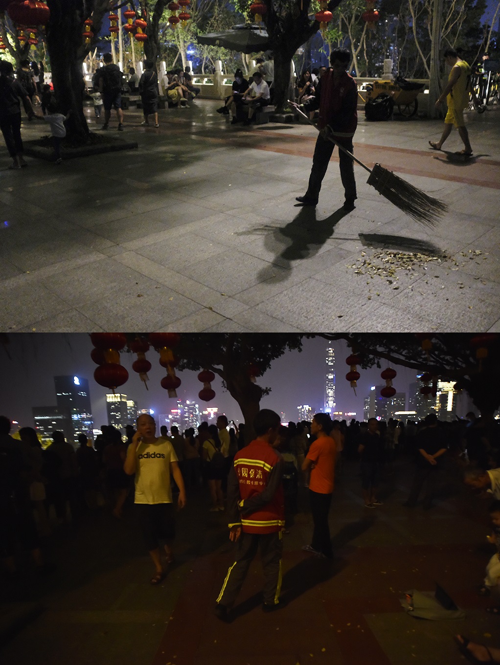 10月8日晚,蓮花山觀景臺(tái)的看燈人潮并沒有燈光秀首秀那一天洶涌,燈光表演過后,只有兩名清潔工人留下來進(jìn)行垃圾清掃?!敖裢砝佟!必?fù)責(zé)蓮花山觀景臺(tái)區(qū)域的環(huán)衛(wèi)工人告訴記者,“我們在燈光秀期間看到垃圾就會(huì)及時(shí)清理,一般散場之后一個(gè)小時(shí)是清掃時(shí)間,但今天這個(gè)工作很快就完成了,深圳人素質(zhì)還是很高的,基本很少有人會(huì)亂丟垃圾?!?/p>
