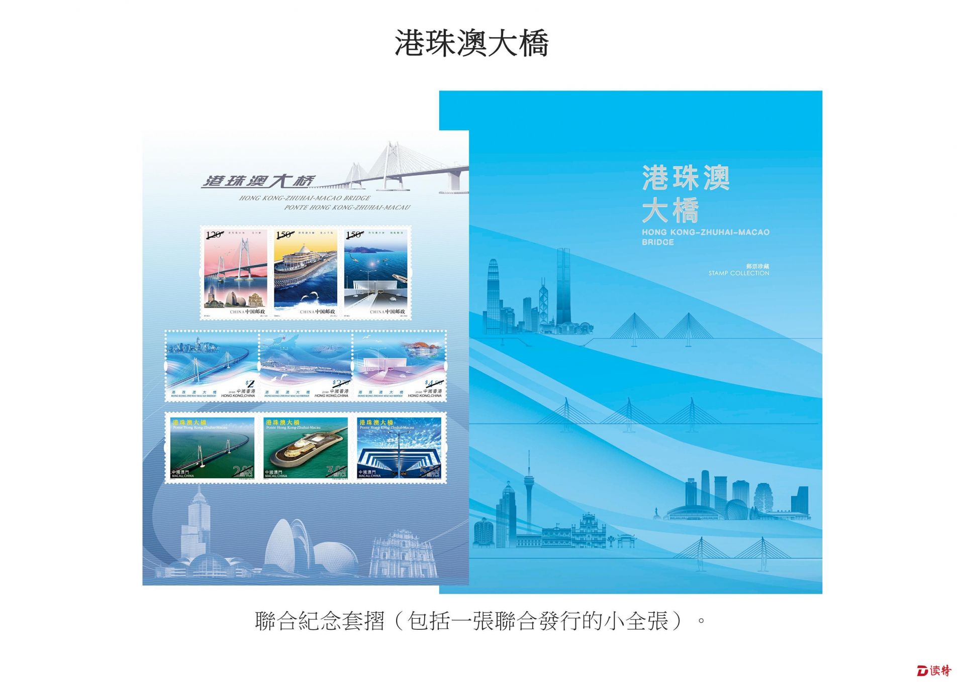 為紀念大橋啟用,中國郵政、香港郵政和澳門郵電于同日共同發(fā)行一款聯(lián)合紀念套折,內附一張小全張,嵌有由三地郵政發(fā)行的特別郵票各一套。