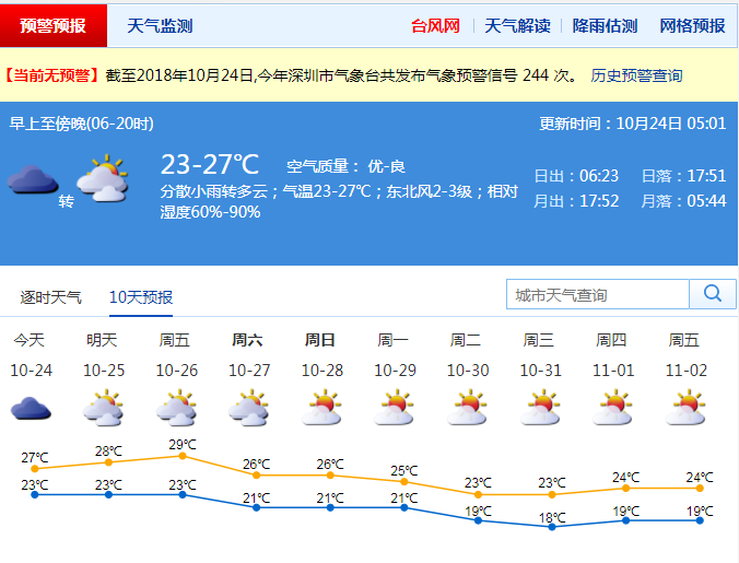 今日,鵬城以多云天氣為主,仍有分散小雨。早晚天氣較涼,最低氣溫在23℃左右,白天最高氣溫升至27℃左右。風力和緩,市區(qū)內(nèi)維持2-3級的平均風力,沿海地區(qū)平均風力3-4級,最大陣風達到6級。相對濕度適中,最小相對濕度為60%,最大濕度90%。